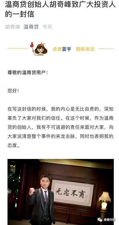 温商贷创始人胡奇峰今日晚间9时左右,通过自家公众号“ 温商贷”,发出致广大投资人的一封信。这封信中提到——