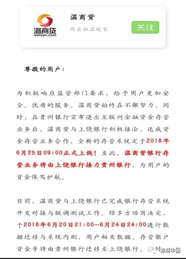 终于,温商贷在2018年6月上线上饶银行,并从6月20日晚上9点开始,温商贷将会做数据迁移,以后的存管银行将会从贵州银行转为上饶银行。
