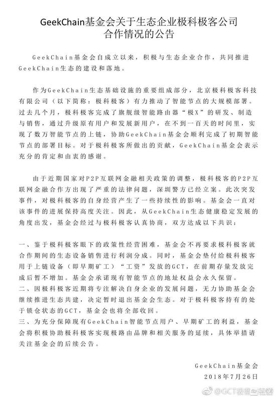 极路由作为其会员企业,推动了智能节电的大规模部署,但是由于极路由的合作方i财富近期出现的问题,GCT基金会表示,极路由因企业自身问题无法协助基金会继续推进生态共建,将退出基金会,对于极路由持有的处于锁仓状态的GCT,基金会全部收回,并且承诺现有智能节点的地址权益永久保留。