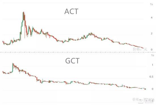 时间回到2018年一月份,几乎是在同一时间,GCT和ACT的币价都到达了一个高位,彼时也是极路由挖矿路由器最抢手的时候。经历短暂小牛市后,GCT和ACT的币价双双走低,截至目前,两者的币价已经跌去95%以上。