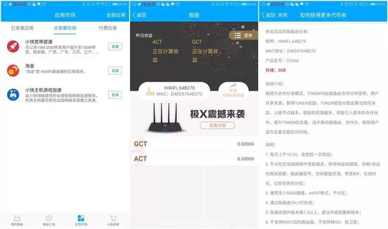 极路由前期通过与i财富的合作,短期内提高路由器的销量;而后推出“极X”计划,200万在线路由器可升级为区块链路由器,顿时全平台的极路由都被疯抢,极路由二手市场价被炒到3-4倍。表面上看,此举可谓一举两得,当时极路由近乎断裂的现金流也得到了缓解,通过P2P和区块链双管齐下,200余万用户节点投入到GCT、ACT的项目中。