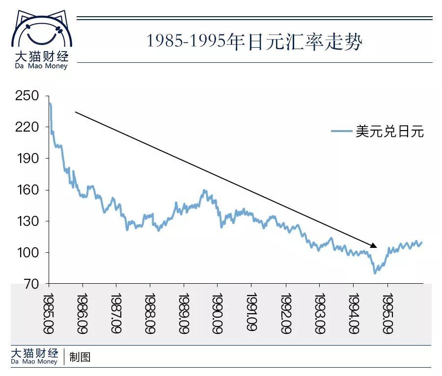 1985年9月,美日等五国在纽约广场饭店举行会议,决定联合干预外汇市场,使美元兑主要货币有序地下跌,以解决美国巨额的贸易赤字,史称”广场协议”,之后,五国开始在外汇市场抛售美元,引发狂潮,美元因此持续大幅度贬值,而日元升值幅度最大,三年间达到了86.1%!