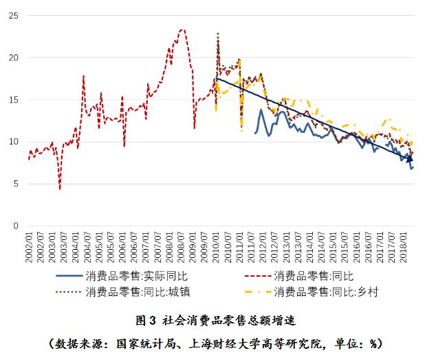 3.通过对老百姓现金流的侵蚀,家庭债务对消费的挤出效应已持续多年,消费增速自2011年开始持续下滑,社会消费品零售总额的增速已经由2011年20%下降至今年6月份的9%。从图3可以看出,在金融危机前,伴随着中国经济的高速发展,消费增速持续增加,峰值甚至高达23%,但金融危机后,该增速持续下滑,已经滑落到2018年6月份的9%,实际增速更是掉到了7%。正如上海财经大学“中国宏观经济形势分析与预测”课题组的一系列报告所指出的,消费增速的下降是收入增速下降、收入差距扩大、社会保障不完善等多方面因素共同作用的结果。但我们相信,家庭债务快速累积导致的对于家庭流动性的挤出作用同样不可忽视。