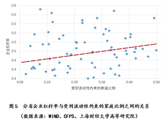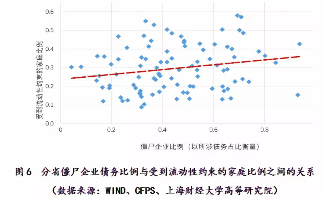 2.企业经营不善还会反过来影响家庭部门,拖累可支配收入增速,从而进一步收紧家庭流动性,产生负反馈效应。当企业经营不善时,就有可能降低员工工资甚至进行裁员,从而反过来也会影响家庭的流动性,特别是,当可支配收入增速放缓的时候,有房贷的家庭以及受到流动性约束的家庭受到的影响更大,大大增加了家庭债务的偿付难度。为了说明这一负反馈机制,我们采用僵尸企业债务占所有企业总债务的比例来表示企业的经营情况,分析了企业经营对家庭流动性的影响,从图6中可以看出,僵尸企业所涉债务占比越高的省份,受到流动性约束的家庭比例越高。借助中国家庭追踪调查数据(China Family Panel Studies,CFPS)的面板结构,我们的模型显示,由于企业经营不善导致的僵尸企业债务占总债务的比例每升高1个百分点,会使得家庭陷入流动性约束的可能性提高0.15个百分点。