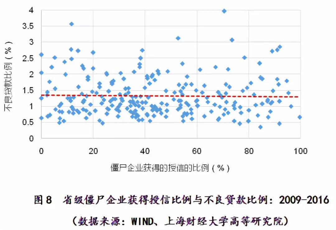 僵尸企业占用金融资源的一个结果就是僵尸企业越高的省份,银行不良贷款比例不仅没有越高,反倒越低。由于缺乏贷款合同层面的微观数据,我们通过考察一省僵尸企业获得授信所占比例与该省商业银行不良贷款比例之间的关系来分析我国商业银行对僵尸企业的输血机制。我们发现,虽然在2005-2016年的样本区间内,僵尸企业获得授信与银行不良贷款比例之间的相关性并不显著,但是二者之间仍是负向关系,即僵尸企业获得的信贷资源越多,商业银行的不良贷款比例越低。2009年之后二者之间的负向关系虽然变得不像之前那么明显,但采用各省僵尸企业获得授信的比例这一衡量一省上市企业中僵尸企业占用该省金融资源的严重程度的指标,我们依然发现商业银行对僵尸企业存在输血的行为。