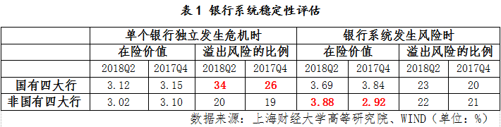 4.金融系统的稳定性已经受到影响。进入2018年以来,商业银行不断加大对家庭部门贷款的投放以及持续对僵尸企业的输血,虽然没有使商业银行的不良贷款率大幅上升,但是虚增的资产规模以及利润增速的下降已使得商业银行的稳定性,甚至银行系统的稳定性日渐变差。我们的模型显示,当单家银行发生风险时,国有四大行的风险溢出率最大。如表1所示,截至2018年二季度,国有四大行的平均风险溢出率为34%,较非四大行同期水平高出14%,较其自身2017年末的水平高出8%。而且,中国工商银行、中国银行和中国农业银行溢出的损失所占比例超过了30%,中国农业银行甚至高达38%,为项目组进行此项评估以来的峰值。而发生系统性风险时,非国有四大行的抗险能力也已显著下降,2018年二季度末其自身在险价值较2017年末上升0.96个百分点。另外,如表1所示,虽然2018年以来国有大行抗击系统性风险的能力依然强于其他银行,但其风险溢出率持续上升,即对稳定银行系统所起到的作用越来越弱。综上所述,进入2018年以来,不论是国有五大行还是其他上市银行,其稳定性明显变差。