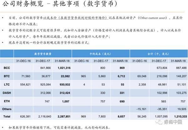比特大陆持有的 BTC 在逐年减少,持有的 BCH( 即图中的 BCC ) 在逐年增加。从 2016 年 12 月末到 2018 年 3 月末,比特大陆持有的 BTC 从 71560 枚减少到 22082 枚,从 2017 年的 12月末到 2018 年 3 月末,持有的 BCH 从841866 枚增加到 1021316 枚。如果这张图属实,那么,比特大陆在今年 3 月份末时,其持有的 BCH 占 BCH 总数量(1730 万枚)的 5% 以上。