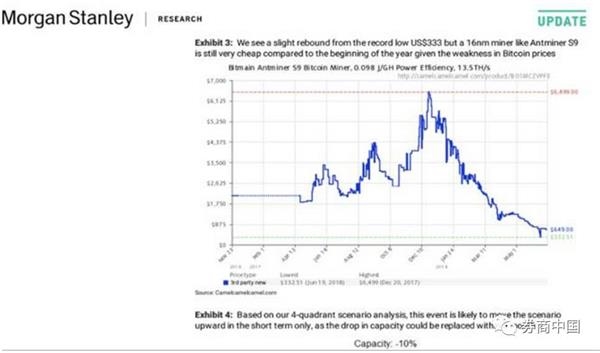 2018年开始加密货币市场跌入熊市,加密货币价格的亏损同时也传导到矿机价格上。Morgan Stanley的研究报告指出, “比特大陆”的主打销售矿机——S9型矿机的价格从2017年底6499美元的顶峰,跌入2018年6月左右649美元的低谷,跌去了整整90%。