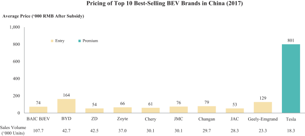 蔚来汽车将至少和三种造车势力在角逐。根据Frost&Sullivan统计数据,2017年中国消费者共购置47.6万辆纯电动车。在2017年销量最高十大纯电动车品牌中,只有特斯拉属于高端市场,而其他九个品牌则属于入门级市场,补贴后平均价格均低于17万元。