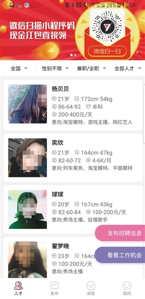 在颜值招聘APP上发布短视频的小艾(化名)告诉记者,她今年19岁,是一名在校大学生,想找一份兼职礼仪工作。在视频中,她介绍了她的名字、年龄、身高、体重等相关信息。她表示,选择这种求职方式是想让招聘方直观地看到她的身形、长相、谈吐和气质。