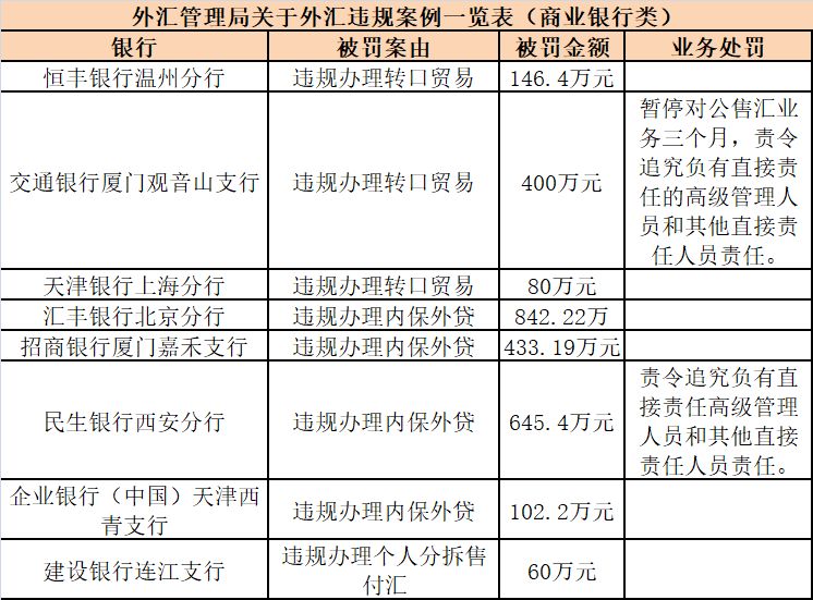 今日,有8家商业银行领到来自外管局的罚单,其中2张罚单金额均超过500万元,违法违规行为主要有违规办理转口贸易、违规办理内保外贷、违规办理个人分拆售付汇三个方面。