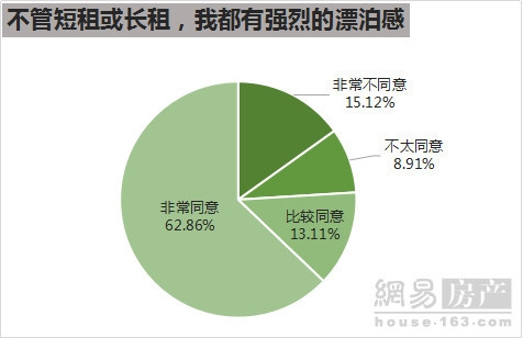 76.0%的人认为,无论是短租或长租,租房都给他们带来强烈的漂泊感。房租压力大、不稳定、孩子落户上学难等问题,都是租房难以成为主流选择的痛点。88.2%的调查对象认为所在城市的房价非常高,但只有66.9%的人表示支持租购并举的政策。即使户口和教育等方面能落实租购同权,也仅有62.4%的调查对象认同“租房也挺好”,且有另外23.6%的人认为,即使租购同权,租房也绝对不是一个好的选择。同时,认为租房将成主流选择的人更少,仅有47.6%,不到一半;还有29.8%的人坚决不认可这样的判断。