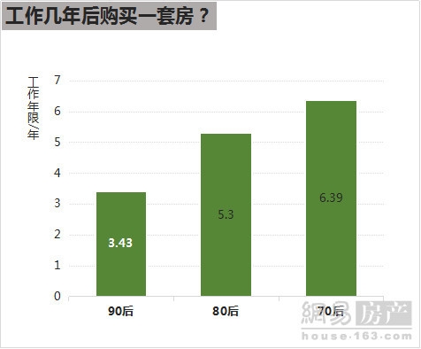 关于购房年龄,70后平均在工作的第6.39年后购买一套房,80后为5.3年,而90后进度最快,为3.43年。