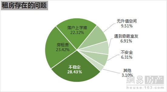 是什么影响了年轻人对租房的认同感呢?调查显示,暂时未有能力购买房产的这些青年,在选择“租房存在的系列问题”项目上,有三个选项排在前面,依次为“不稳定”(28.4%)、“房租太贵”(23.4%)、“ 落户及孩子上学问题”(22.3%)。其中,90后更为在意租房时“遇到奇葩室友”(9.79%)。