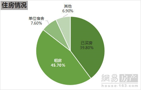 调查结果显示,城市青年有房比例为39.8%,另外45.7%的青年则选择了租房。具体到不同年龄层,90后租房比例最高,为56.5%,80后和70后则分别为43.7%和30%。分城市来看,一线城市中广州房租最低、通勤时间最短、租房搬家次数最少、有房比例最高。