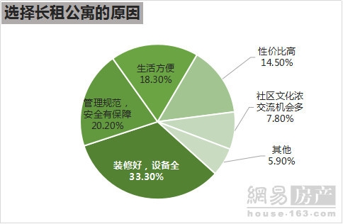 而选择长租公寓的群体则表示,装修好、设备全是最大的优点(33.3%),管理规范、安全有保障也是一大竞争力(18.3%)。