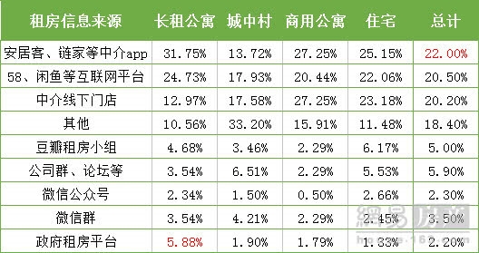 数据显示,目前最受欢迎的租房方式为安居客、链家等中介的线上app平台(22.0%),其次为58、闲鱼等互联网服务平台(20.5%),然后才是中介线下门店(20.2%)。政府租房平台仍未发挥实际效用,仅有2.2%的租房者会通过这样的官方平台获取租房信息。