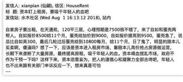 8月初,一名叫“仙翩”的网友在清华的水木社区网络论坛上发布《资本盯上租房,要吸干年轻人的血吧》一文称,自家天通苑的120平米三居要出租,心理预期价位是7500元/月。在自如和蛋壳公寓两家公司询问后,却被两方争抢。最终蛋壳给到10800元/月的价格。该文引发了长租公寓哄抬北京房租的舆论热潮,自如、蛋壳被推到了风口浪尖。
