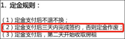 还有“霸王条款”:定金支付后三天内完成签约,否则定金作废。