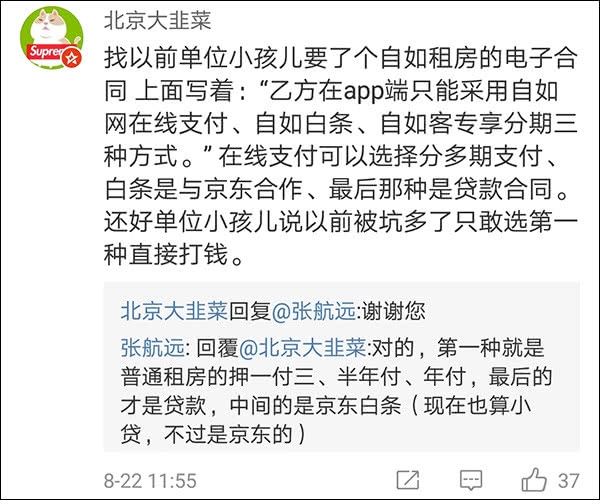 然后,自如跟租户签订合同的时候,租户签订的是贷款合同,银行把一年的租金一次性付清。