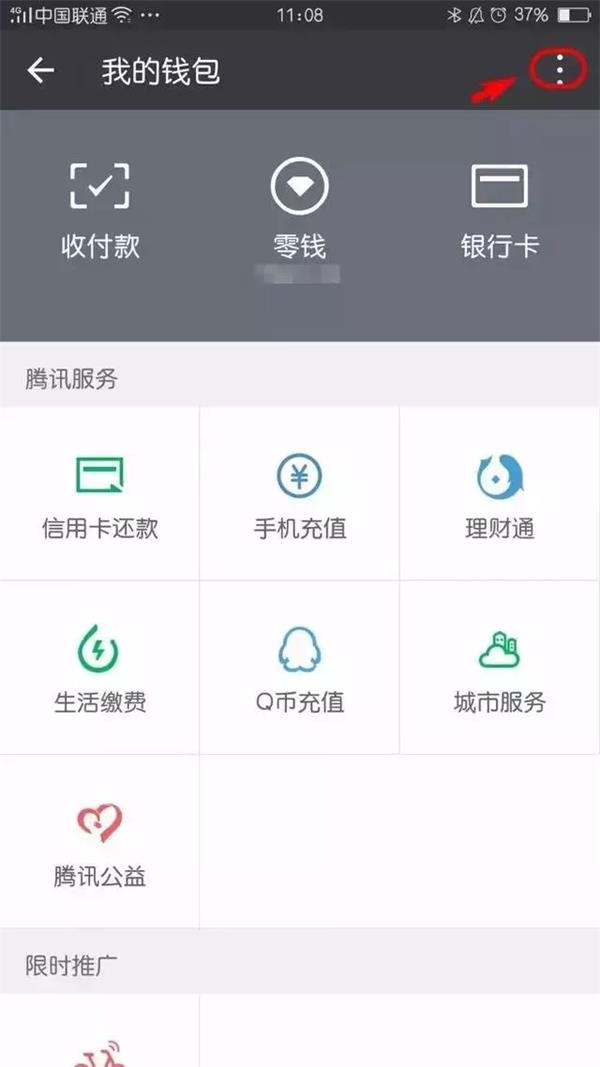 1 、进入微信中的“钱包” , 点击右上角三小点
