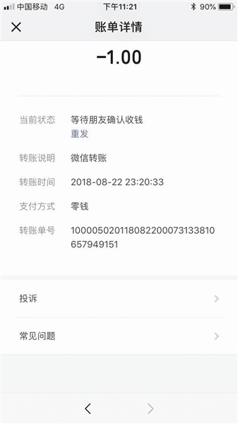 这存在电信欺诈风险的1毛钱转账,怎么才能要回来呢?记者点击账单详情后,发现页面底部有一个“投诉”,点进去后首先有两个投诉选项:账户被盗,钱不是我付的;我被骗了,钱是我付的。