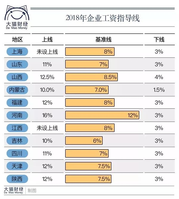 一般来讲,工资指导线分为三条线,上线、基准线和下线,但是部分省份并未设置上线,比如上海市就规定,上年平均工资水平低于全市职工平均工资60%的企业,增长幅度可适当高于平均线,但并未规定具体的上浮幅度。