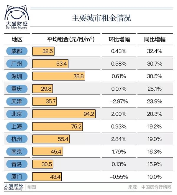 21世纪经济研究院对11个重点城市进行了监测,数据显示7月房租涨幅最高的城市并不是北京与上海,而是成都,同比涨幅高达31%,成为11个重点监测城市的涨幅之首,而广州和深圳次之,分别为30.7%和30.5%,而北京21.89%的涨幅仅列第6位,相对涨幅较低的为厦门,幅度也达到了10%。