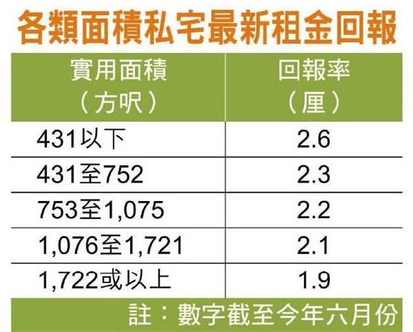 在香港的私人住宅物业中,各类户型里租金回报率最高的,是实用面积431方呎(相当于40平米)以下的单位。据差饷物业估价署的统计,今年6月份的租金回报率约2.6%,创下历史新低,其他面积的房产回报率也创下历年最低。