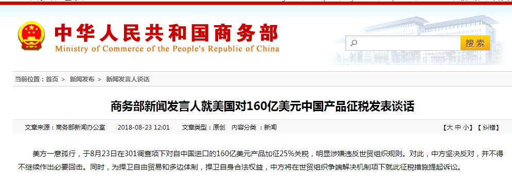 8月23日,商务部新闻发言人就美国对160亿美元中国产品征税发表谈话,美方一意孤行,于8月23日在301调查项下对自中国进口的160亿美元产品加征25%关税,明显涉嫌违反世贸组织规则。对此,中方坚决反对,并不得不继续作出必要回击。同时,为捍卫自由贸易和多边体制,捍卫自身合法权益,中方将在世贸组织争端解决机制项下就此征税措施提起诉讼。