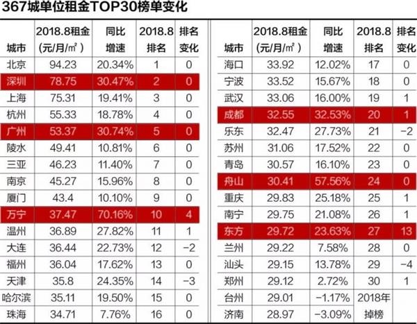 从同比增速来看,北京租金的绝对水平虽然高,但是同比增速并不算最疯狂。万宁以超过70%的同比增速位列第一,舟山也达到了58%,深圳、广州、成都的同比增速也均超过30%,东方虽然同比增速仅有24%,但在租金排行榜的排名大幅上升了13名,台州和济南则掉出前三十。这样看来,这一波租金上涨,增速最疯狂的其实都是旅游城市。