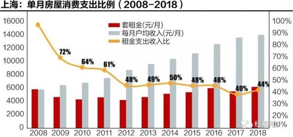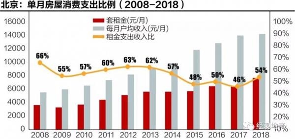 从北京和上海这两个超级城市的租金支出收入比来看,最近十年,相比上海2012年以后稳定在50%以下,北京的租赁负担还是比较重的,2008年最高,达到了66%,2017年最低,仅为46%,2018年拉升到54%,但实际上还低于2008年-2014年的历年水平。