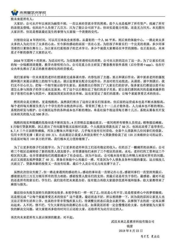 “未来星艺术学校的第一个五年只是刚刚开始!”2016年武汉未来之星教育科技有限公司(以下简称“未来星”)在其五周岁庆生时曾表示。没想到,第二个五年刚开始就结束了。8月23日,社交媒体上流传了一封其创始人钱雷发布的《致未来星所有人》信,钱雷在信中称“公司已经无力再继续”,未来星正式倒闭。交了学费的家长们无奈只能争相在媒体上曝光遭遇。