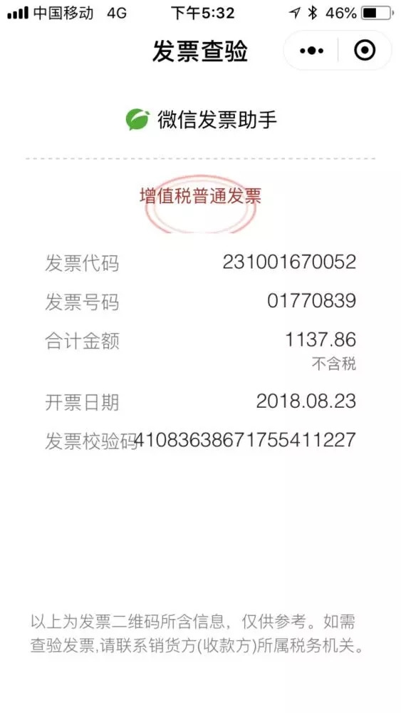 收到发票后,记者立即用微信扫描左上角二维码,自动跳转出的发票信息。