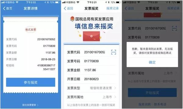 在国家税务总局全国增值税发票查验平台上输入发票的“发票代码”后,始终显示“发票代码输入有误”;而在支付宝平台,显示出了发票为“卷式发票”及基本信息,但点击“国税总局有奖发票应用”的“开始摇奖”选项后,则显示“抱歉,暂未查询到此发票,无法摇奖,请核对发票信息或稍后再试。”