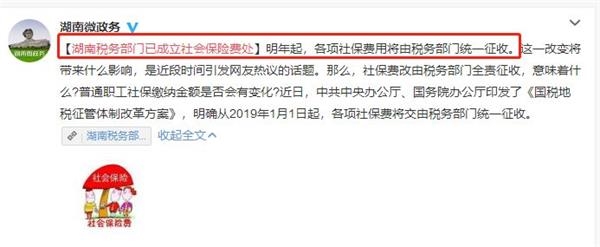 8月20日,国家税务总局、财政部、人力资源和社会保障部、国家卫生健康委员会、国家医疗保障局视频会议部署,今年12月10日前要完成社会保险费和第一批非税收入征管职责划转交接工作,自2019年1月1日起由税务部门统一征收各项社会保险费和先行划转的非税收入。
