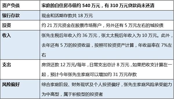 张先生在银行工作,处于职业上升期;张太太就职于事业单位,工作稳定且福利较好。2015年,张先生结婚,在北京贷款买房,2018年下半年家庭将增加新成员,即将进入人生新阶段,张先生家庭资产负债及收支情况如下: