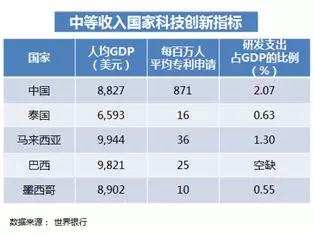 现在中国的人均GDP是9000美元左右,和中国差不多的中等收入国家包括泰国、巴西、马来西亚等等。从人均研发投入、专利指标等科技创新指标来看,中国远超同等人均GDP的这些国家。