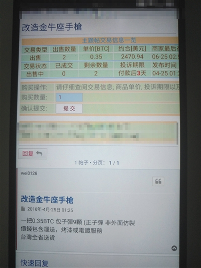 “暗网”论坛一则帖子包含出售枪支弹药的信息。翻拍手机屏幕