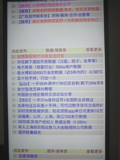 “暗网”论坛中存在大量出售个人信息内容。翻拍手机屏幕