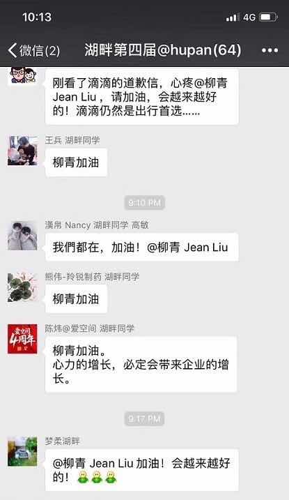 这个微信群叫“湖畔第四届“,显示群成员有64个人。截图中最上端的发言是这样的:“刚看了滴滴的道歉信,心疼@柳青,请加油,会越来越好的!滴滴仍然是出行首选。”