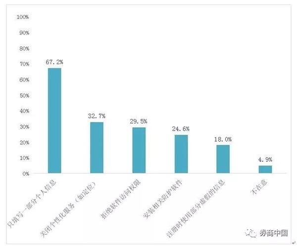 也有很多人采取诸多措施防范信息泄露。根据调查结果,受访者在使用APP时主要通过只填写一部分个人信息来保护个人信息安全,占67.2%。其他选择关闭个性化服务(如定位)的有32.7%,拒绝软件访问权限有29.5%,安装相关防护软件有24.6%,注册时使用部分虚假的信息有18.0%,有4.9%的受访者表示“不在意”。