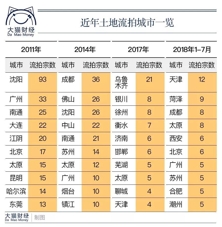 和前几年的数据对比,会发现今年流拍城市,一二线城市总数增多。2018年,天津流拍宗数高达12宗,而去年天津只有4宗。2017年流拍宗数较多的城市是乌鲁木齐达到21宗,而2011年是沈阳93宗。显然,风格已切换。