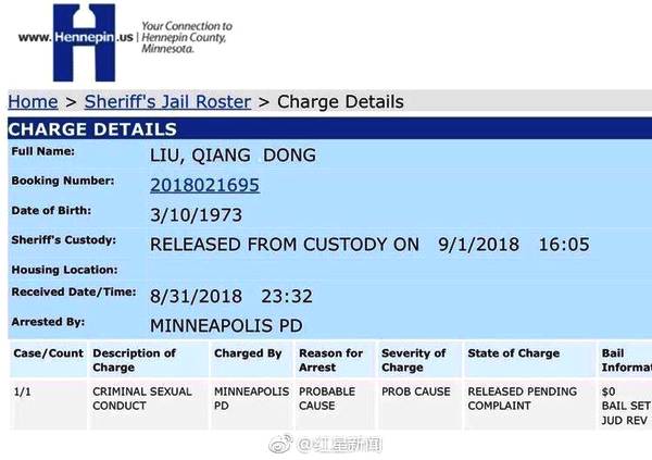 据美国明尼苏达州监狱官网显示,的确有一名名叫Liu Qiang Dong(吃生日期1973年3月10日,与京东刘强东一模一样)的人,因性侵指控,在8月31日晚23:32的时间抵达监狱被收监。次日也就是9月1日的16:05时候,刘强东被释放,没有缴纳保释金。