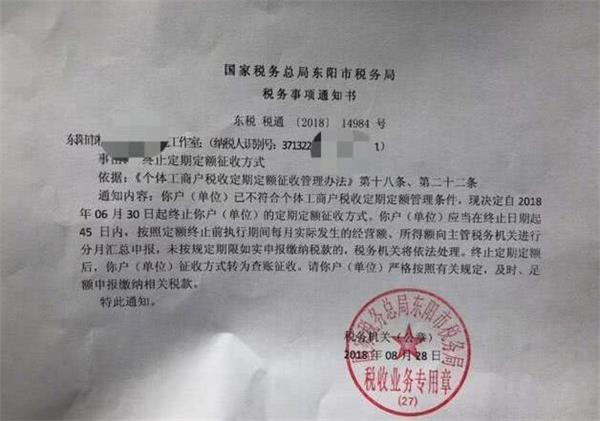 通知显示,依据《个体工商户税定期定额征收管理办法》,影视工作室已不符合个体工商户税收定期定额管理条件,2018年6月30日起将终止定期定额征收方式,要求影视工作室45天内,按照定额终止前执行期内每月实际发生的经营额、所得额向主管税务机关进行分月汇总申报,未按规定期限如实申报缴纳税款的,税务机关将依法处理。终止定期定额后,征收方式将改为查账征收。