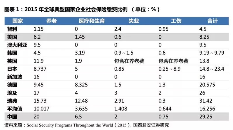 国泰君安在报告中称,中国企业社保缴费比例极高,不仅普遍高于发展中国家,而且高于大多数发达国家。对企业而言,社保费用是企业人力成本的重要组成部分,社保费率的高低直接影响着企业的盈利能力和产品的竞争力。