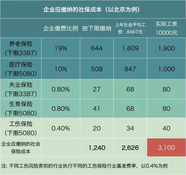 企业需要多缴:3100 - 1240 = 1860元/ 人/ 月