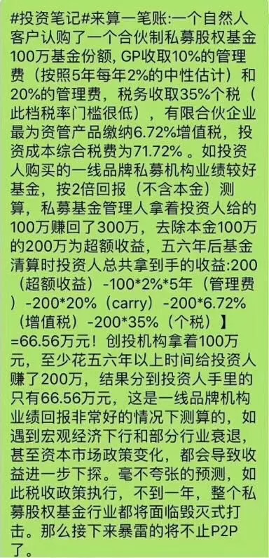 这是什么意思,就是说如果你把钱放进创投基金,最后得到的投资收益将被征收35%的税,对此有人算了一笔账:
