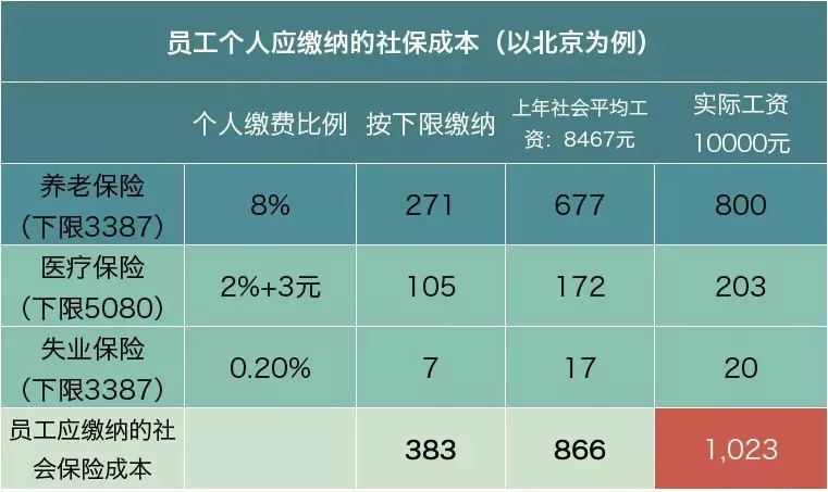 新政实施后员工需要多缴:1023 - 383 = 640元/ 月