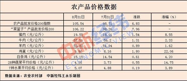 具体来看,8月31日,“农产品批发价格200指数”为105.54,较7月31日上涨6.83点;“菜篮子”产品批发价格200指数为106.22,较7月31日上涨7.96点。其中,全国农产品批发市场猪肉平均价格累计上涨1.54元/公斤,涨幅8.55%;鸡蛋价格累计上涨1.8元/公斤,涨幅达到22.06%。